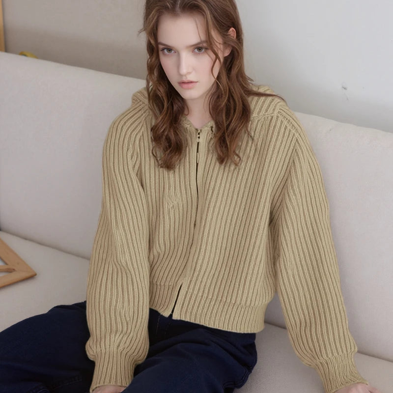 Autumn Winter Hooded Cardigan Casual Loose Sweater Long Sleeved Short Knitted Jacket Sweet Zipper Top Elegant Solid Knitwear