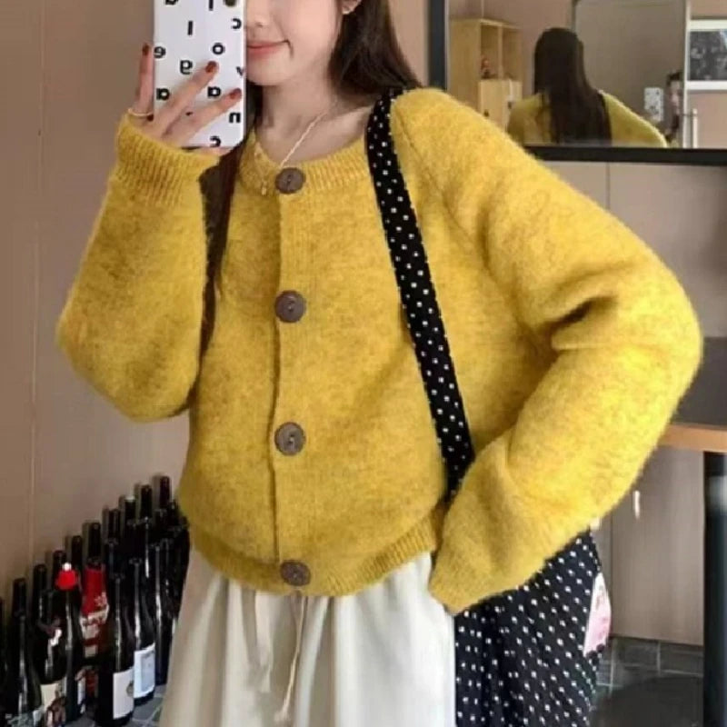 Lazy Style Solid Color Loose O Neck Korean Women's Casual Cardigan Spring Autumn Fashion Simple Soft Versatile Knitted Sweater