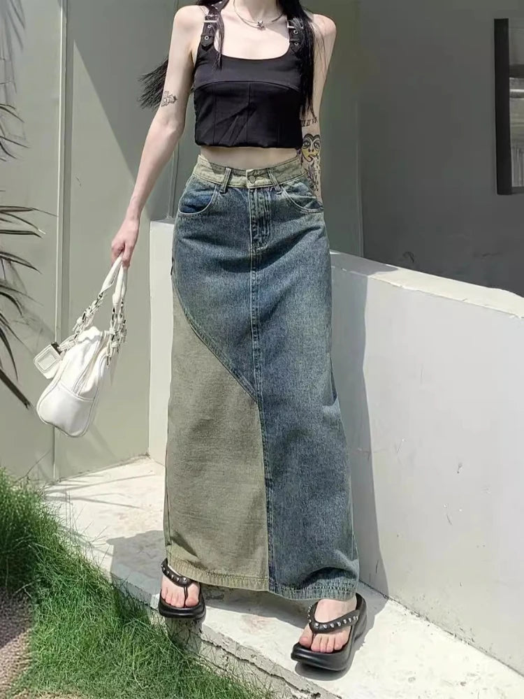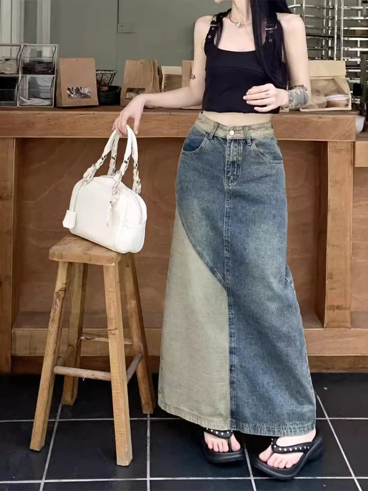 New in Spring Autumn Women Fashion Vintage High-waisted Slimming Medium-length Color Blocking Denim Skirt for Women Clothing
