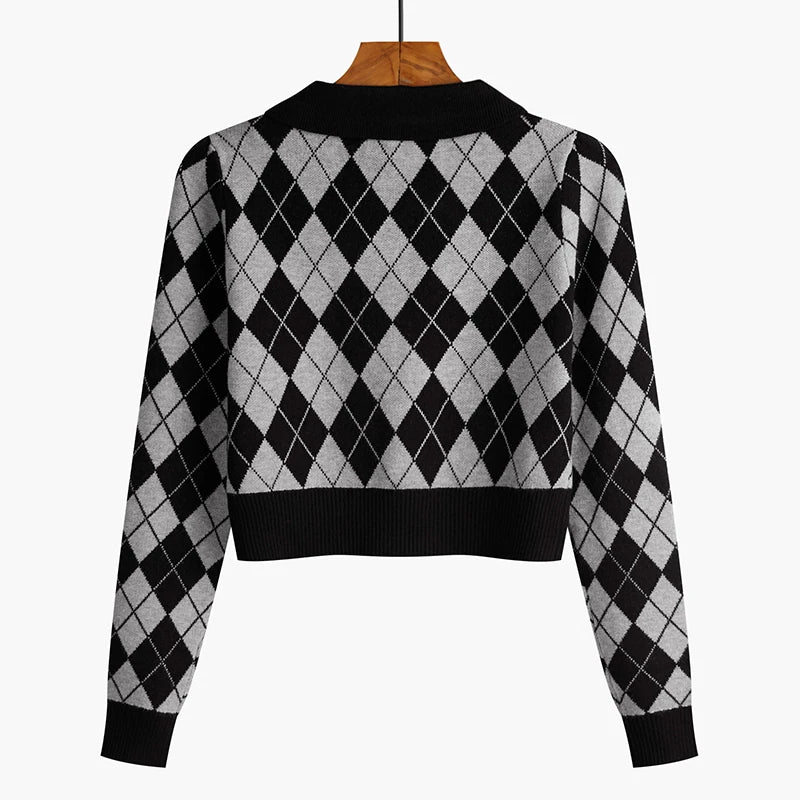 Knitted Sweater Women Cardigans New Long Sleeve Turn Down Collar Plaid Knit Sweater Cardigan Women Tops Sweaters Knitwears Q826