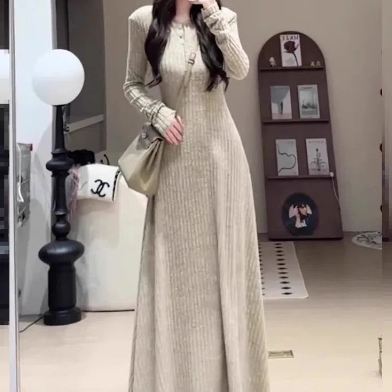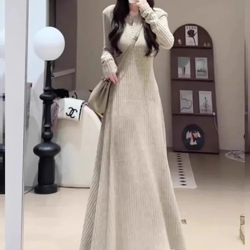 Autumn Winter French Retro Waist Cinching Slimming Mid to Long Style with Inner Lining Skirt Temperament Long Sleeved Dresses