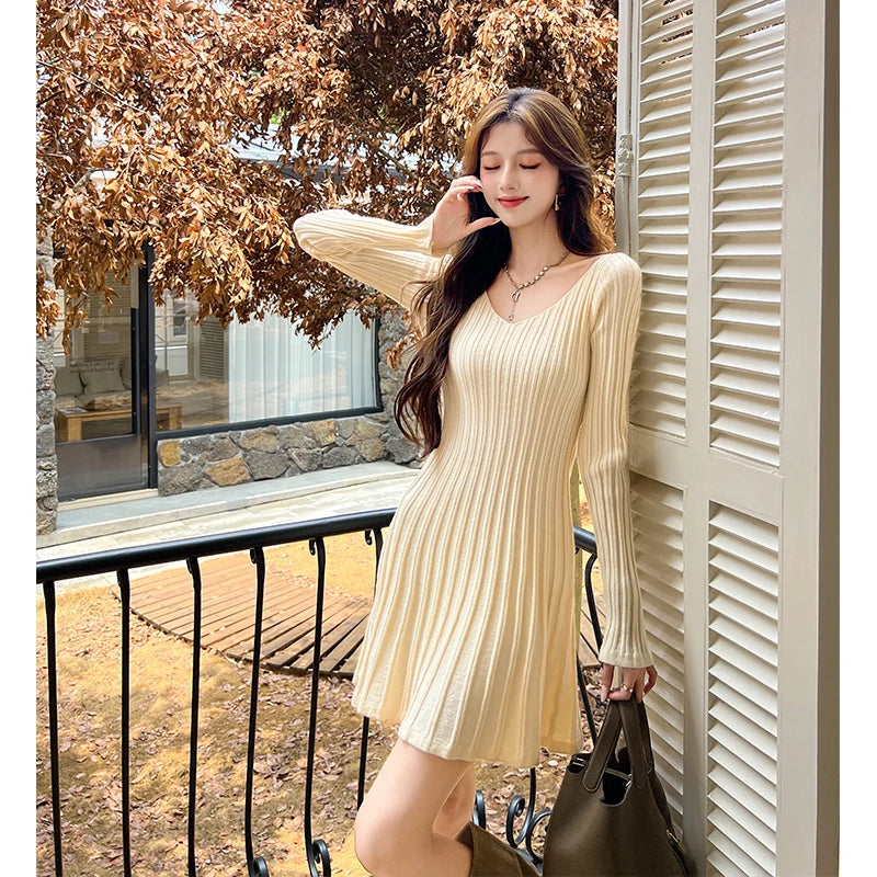 Autumn Winter Beige Temperament Long Sleeved Slim Knitted Mini Dress Women V Neck Wrap Hip Short Dress Fashion Simplicity Casual