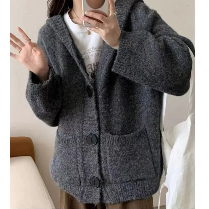 Autumn Winter New Hooded Cardigan Casual Loose Long Sleeved Short Knitted Jacket Sweet Zipper Top Elegant Solid Color Knitwear