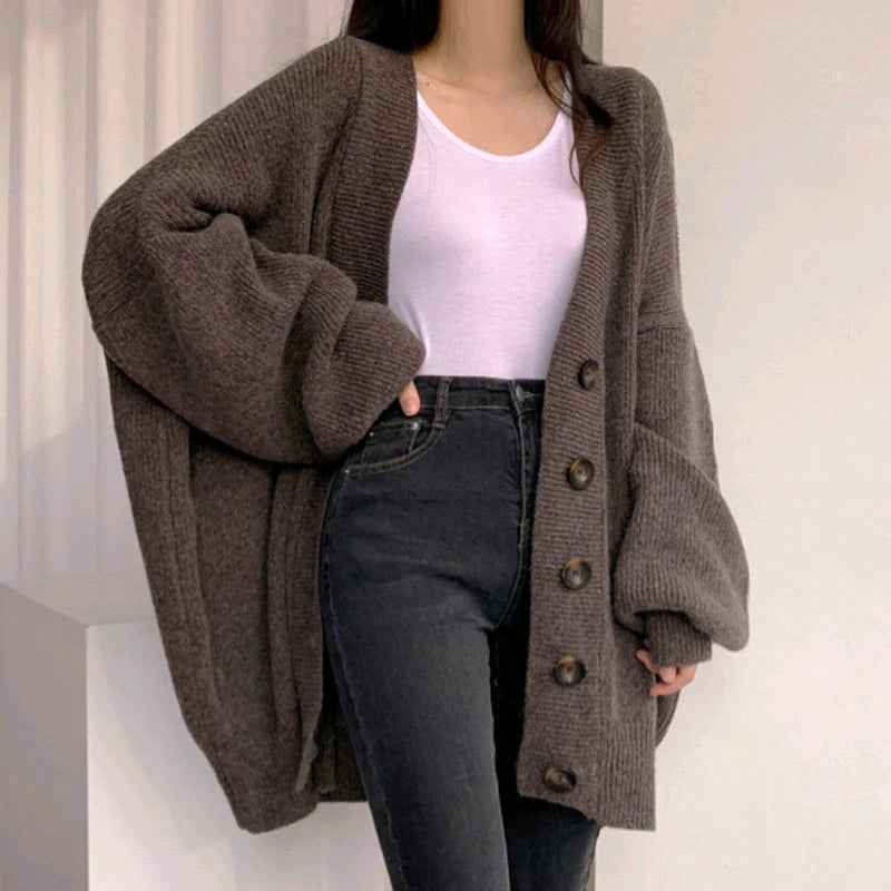 V-neck Single-breasted Loose Knitted Cardigan Sweater New Women Casual Lantern Sleeve Coat Autumn and Winter Fashion Clothing