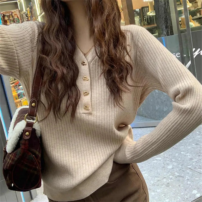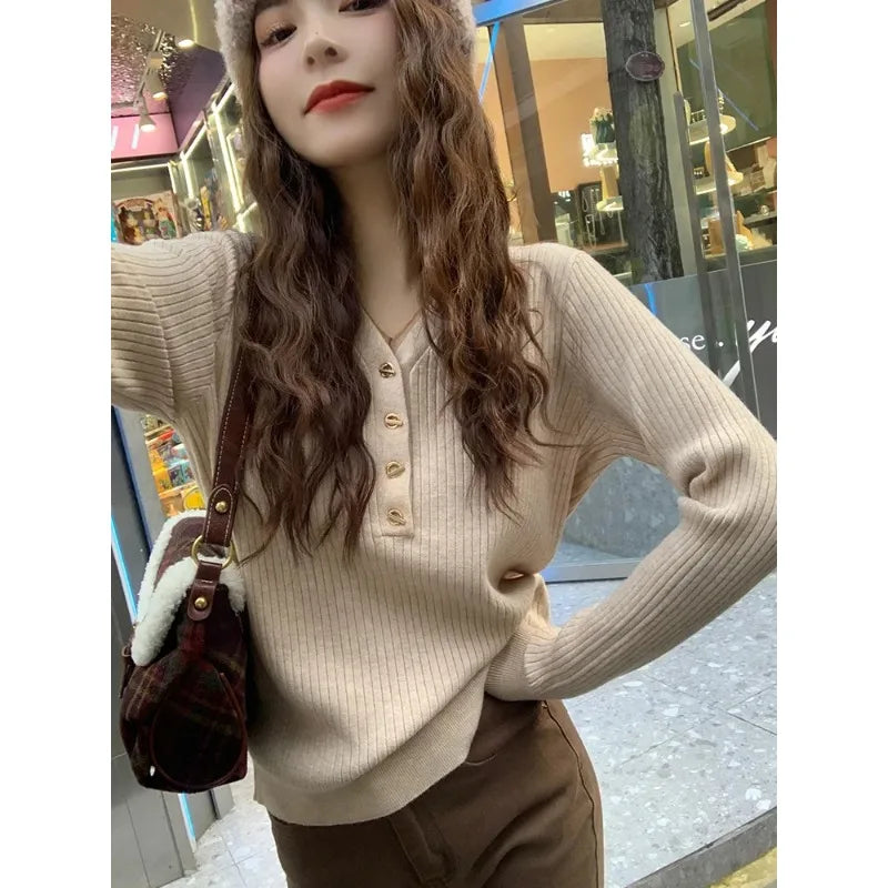 Fashion Korean V-neck Solid Color Long Sleeved Women's Knitted Base Sweater Autumn and Winter New Simple Casual Pullover Tops