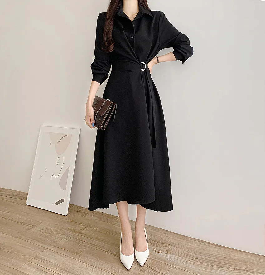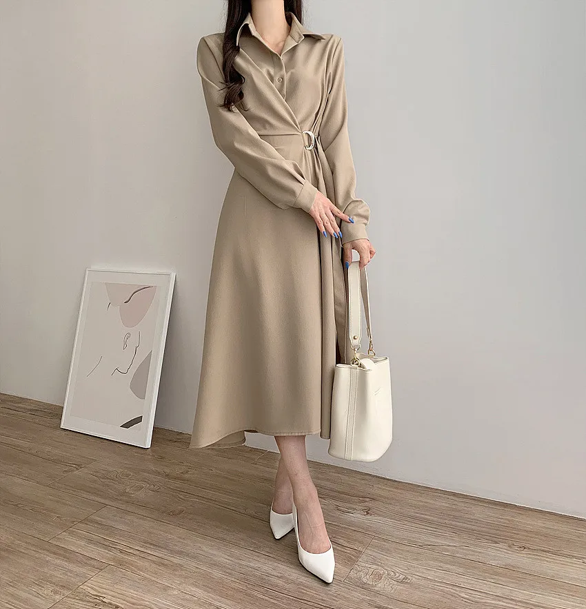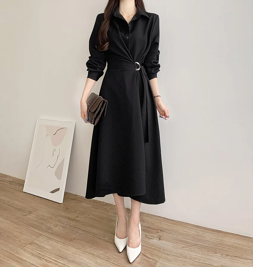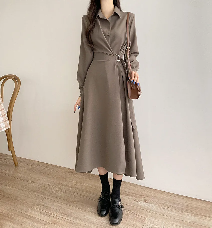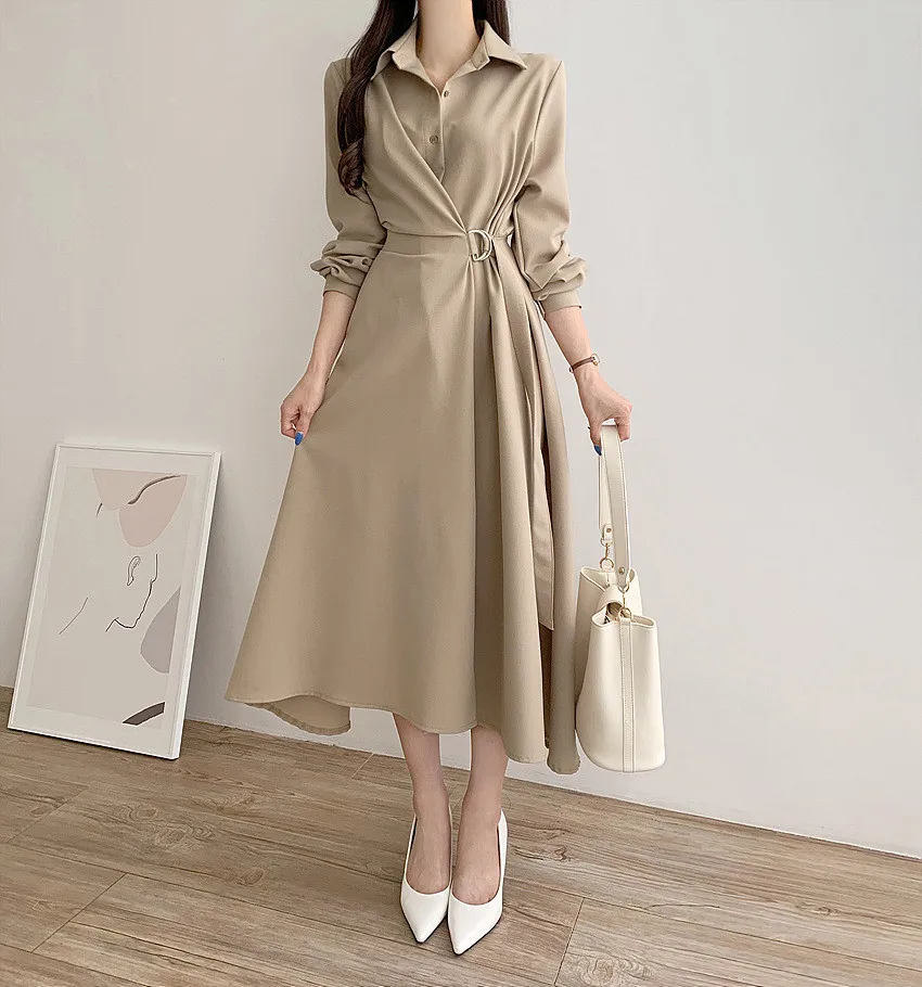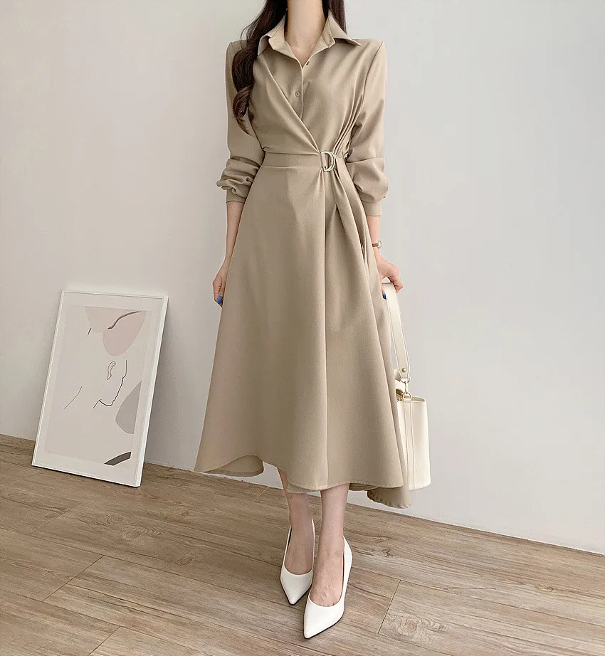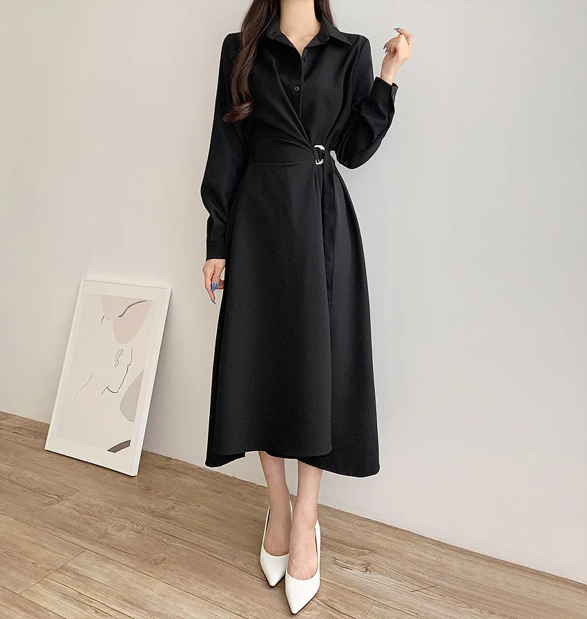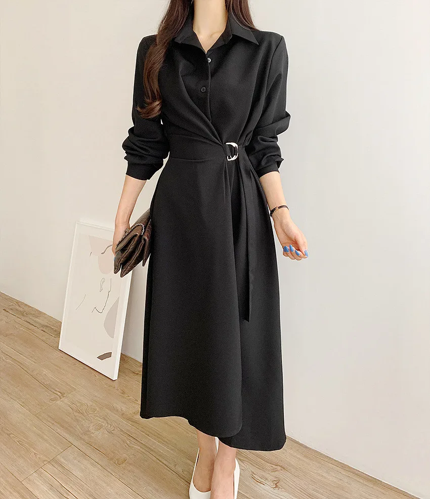 This chic Korean-style dress exudes elegance with its sophisticated collar and single-button side waist design, perfect for the fashion-conscious woman.
