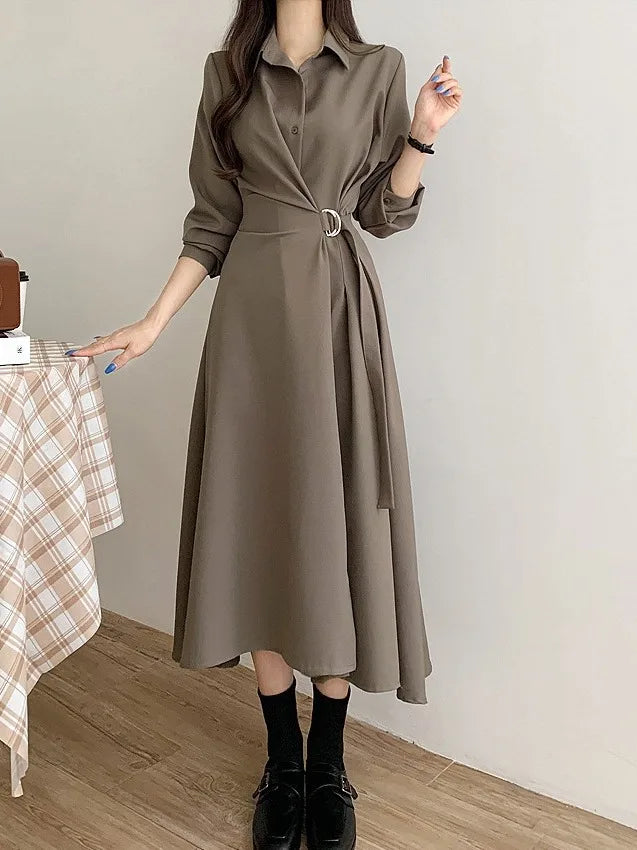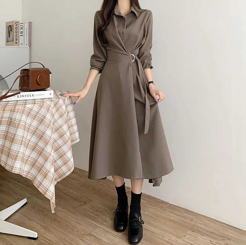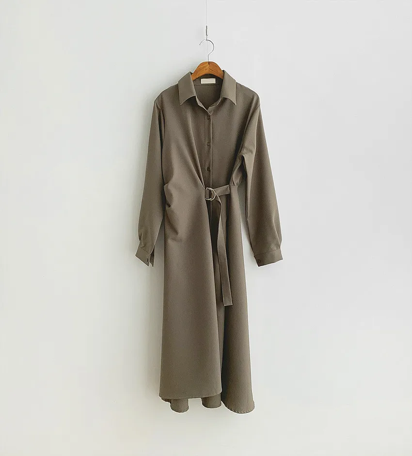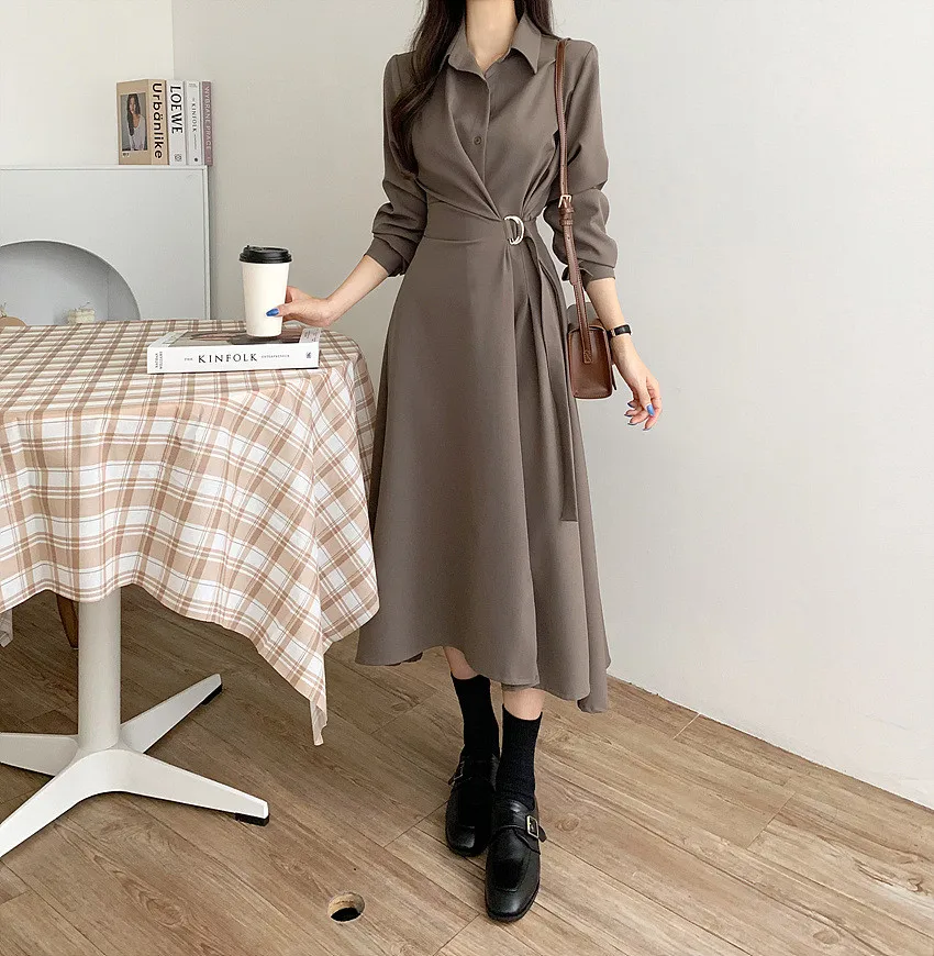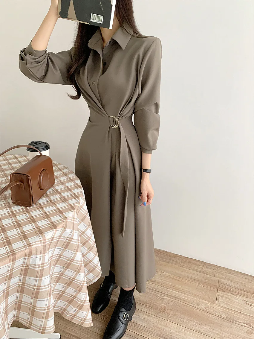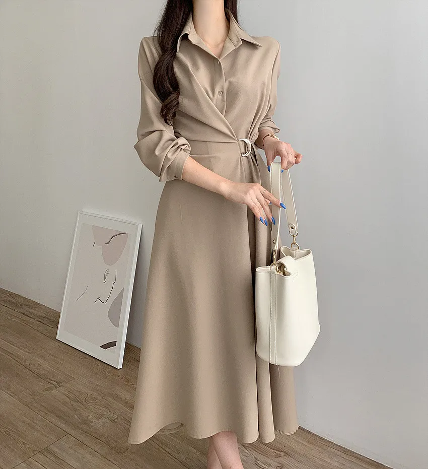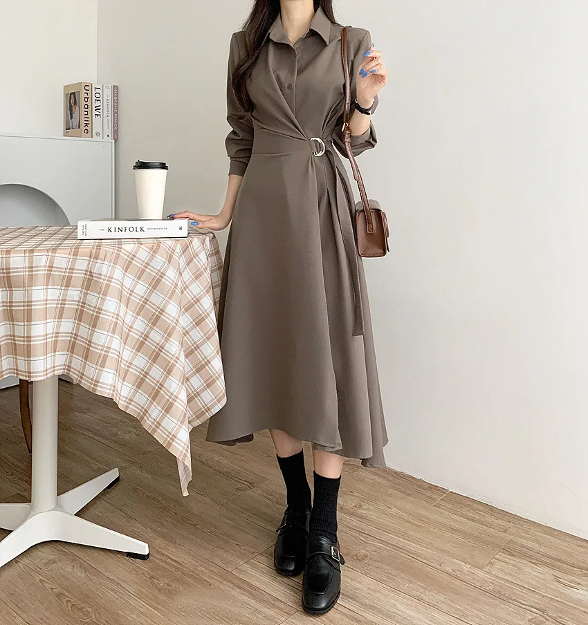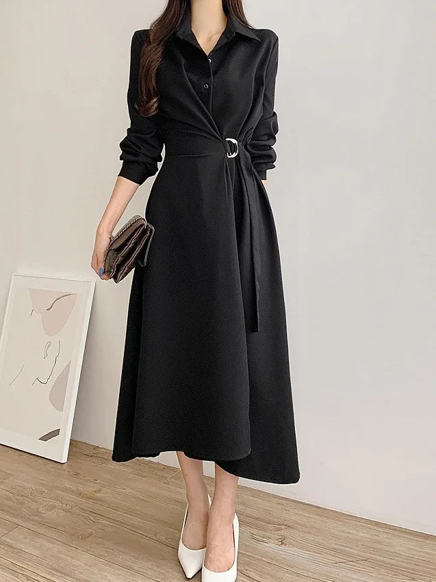 This chic Korean-style dress exudes elegance with its sophisticated collar and single-button side waist design, perfect for the fashion-conscious woman.