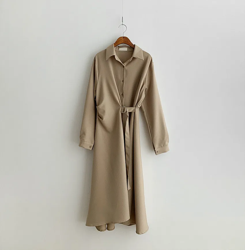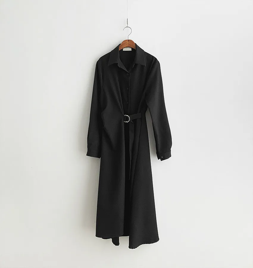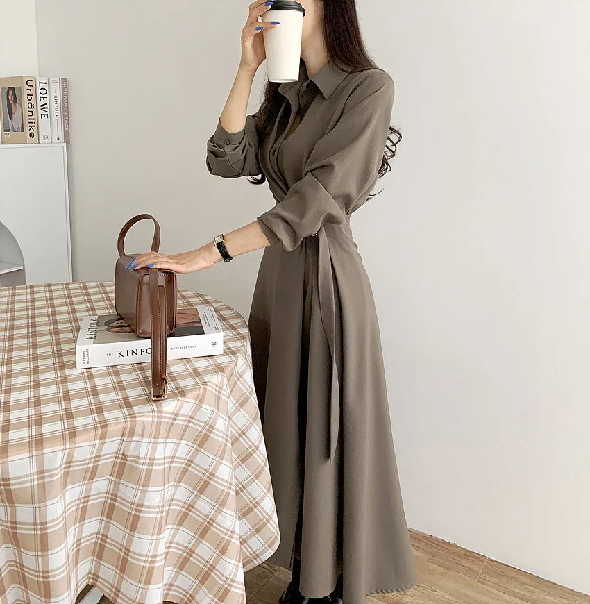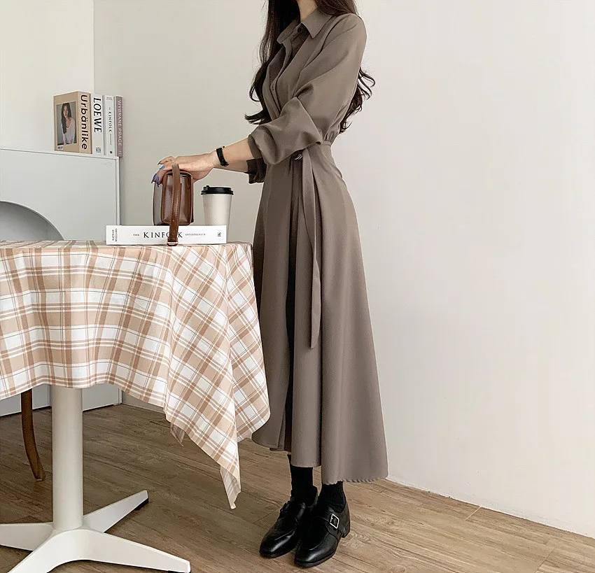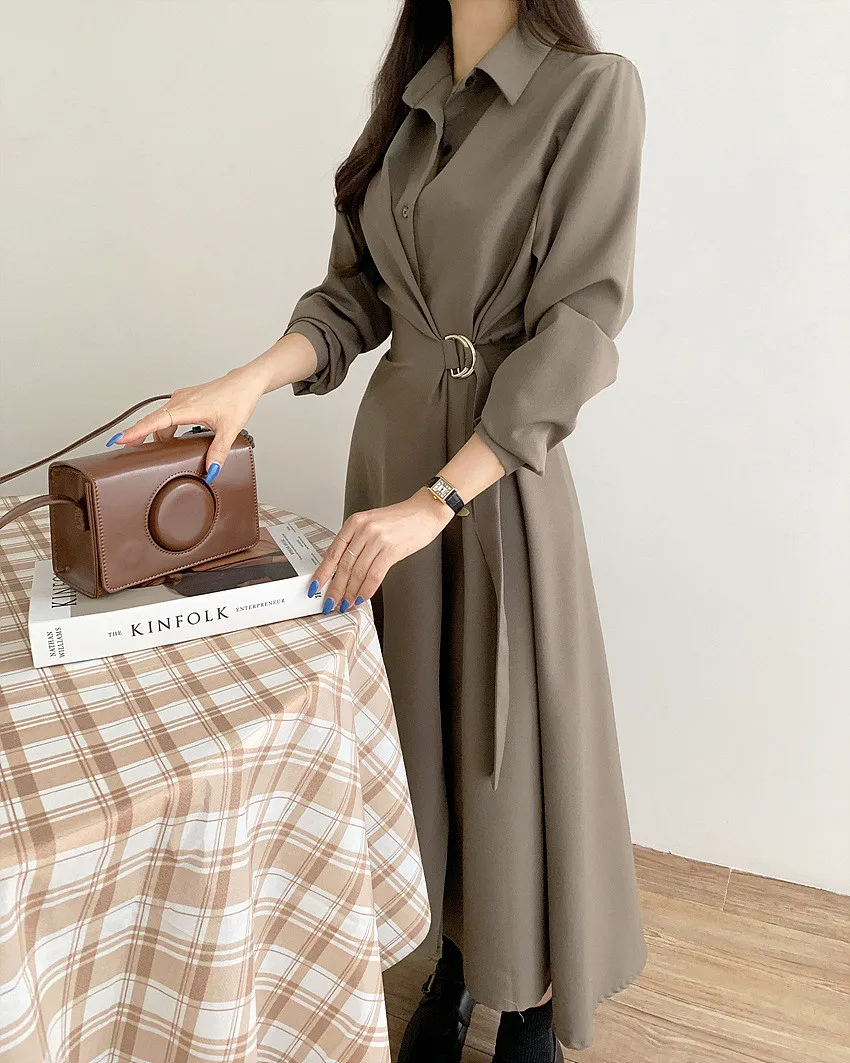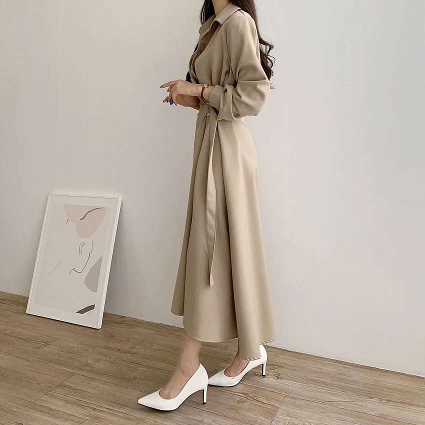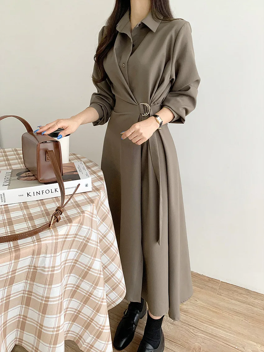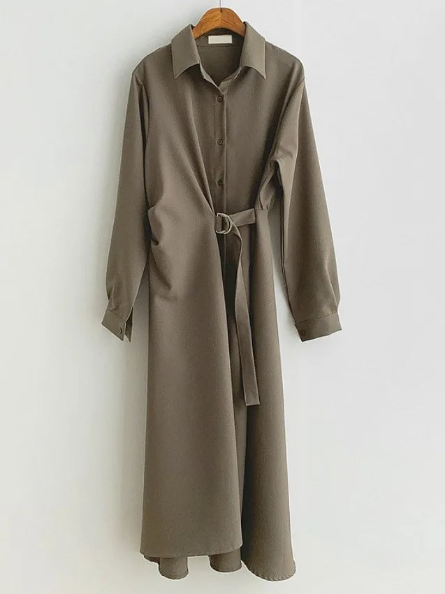 This chic Korean-style dress exudes elegance with its sophisticated collar and single-button side waist design, perfect for the fashion-conscious woman.