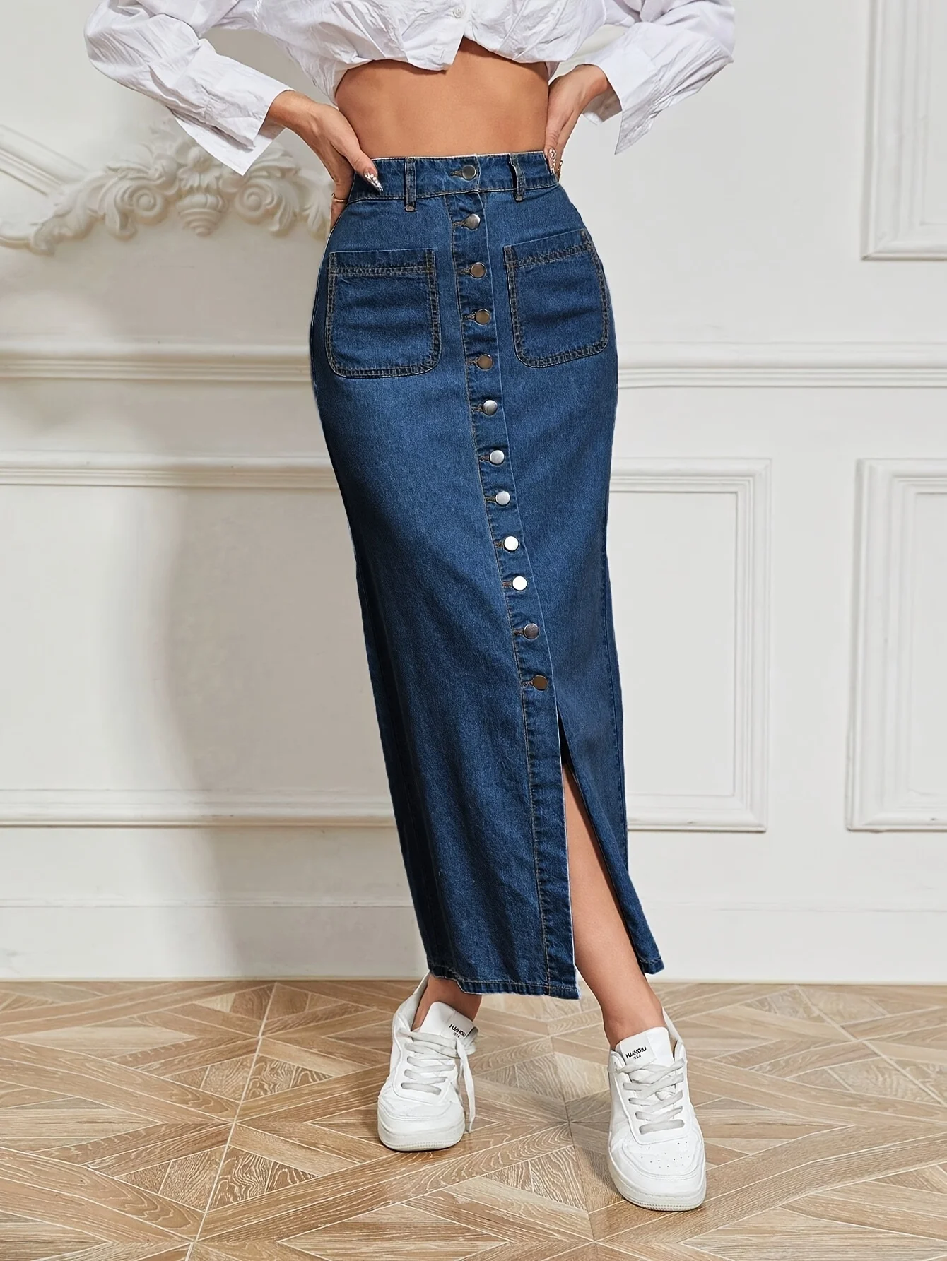 The long length of this denim skirt provides coverage and adds a timeless appeal to your wardrobe.